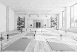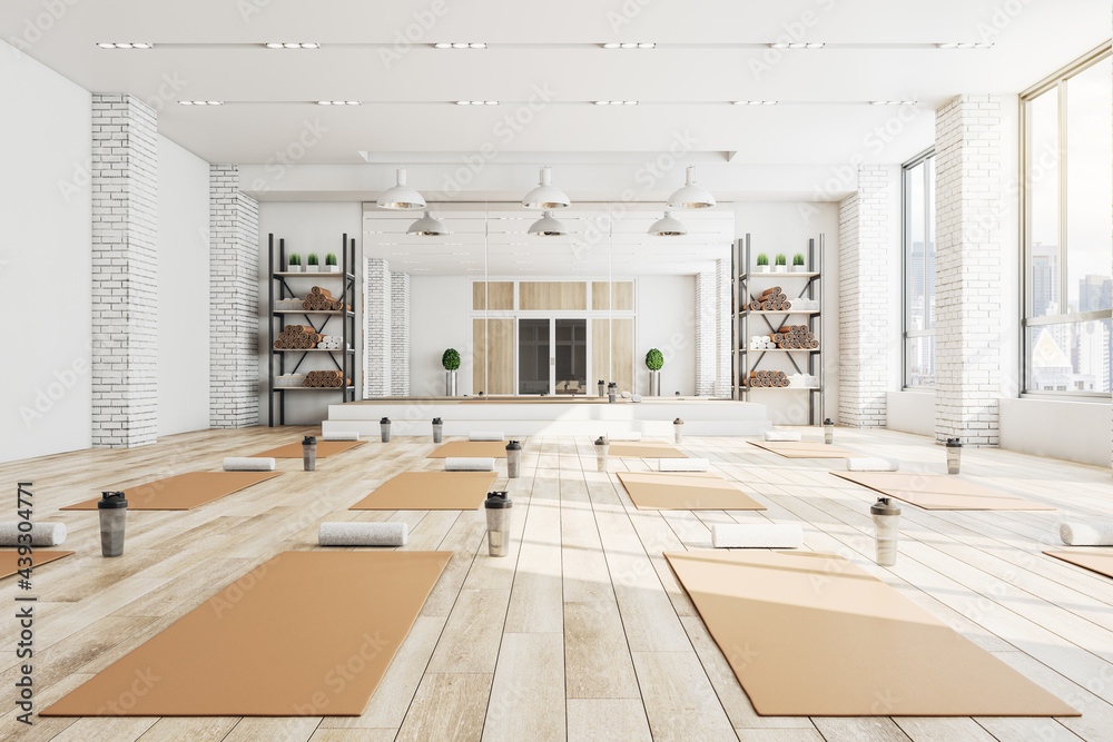 Modern concrete yoga gym interior with equipment, daylight and wooden flooring. Healthy lifestyle concept. 3D Rendering.