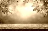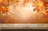 A wood table product display with copyspace and a golden brown autumn background of leaves for Thanksgiving and other seasonal messages.