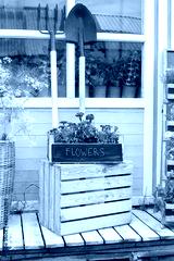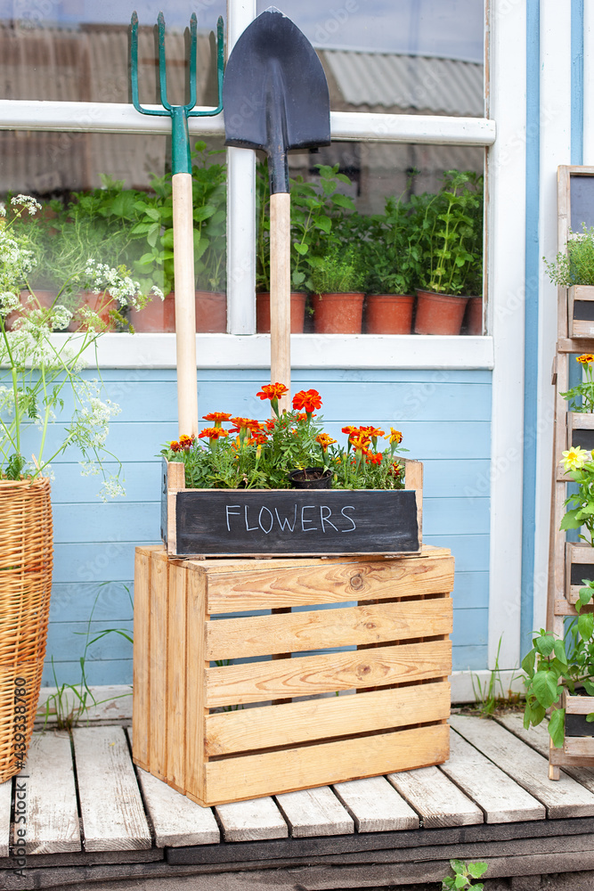 Blooming orange Tagetes flowers in pot on verande. Flower shop. Summer decor veranda house. Growing potted house plants. Exterior wooden porch of house with green plants, herbs and flowers in box.