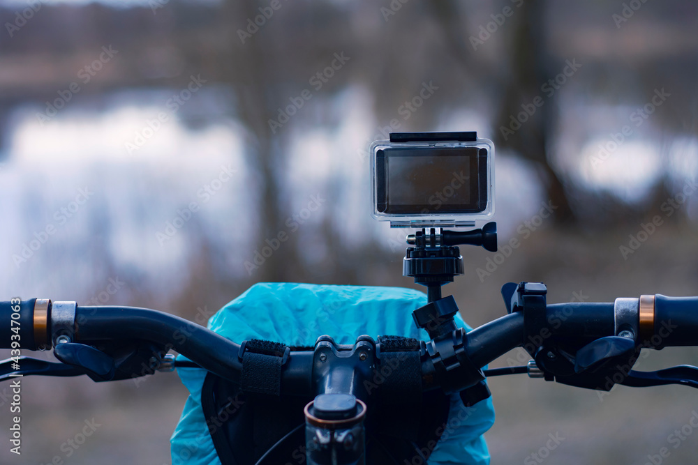Action Camera on a bike with a bikepacking bag in a waterproof case against the backdrop of river.