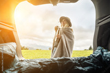 Girl resting in her car. Woman hiker, hiking backpacker traveler camper in sleeping bag, relaxing, drinking hot tea on top of mountain. Road trip. Health care, authenticity, sense of balance calmness.