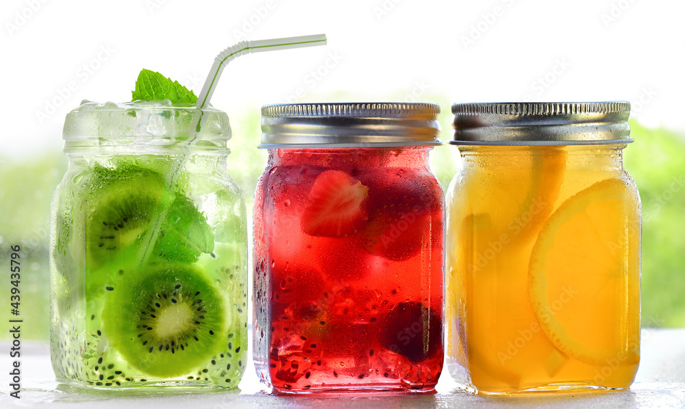 Bright Colorful refreshing summer drinks in glass jars with ice on white background