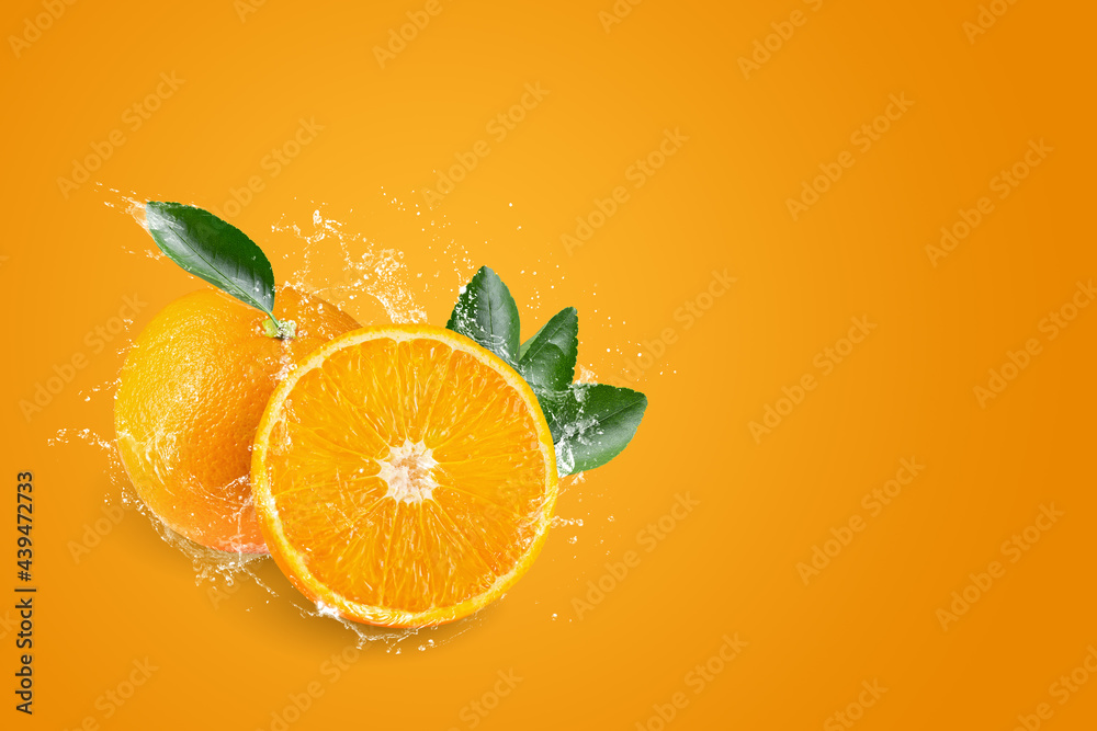 Water splashing on Orange juice freshly squeezed on an orange background.