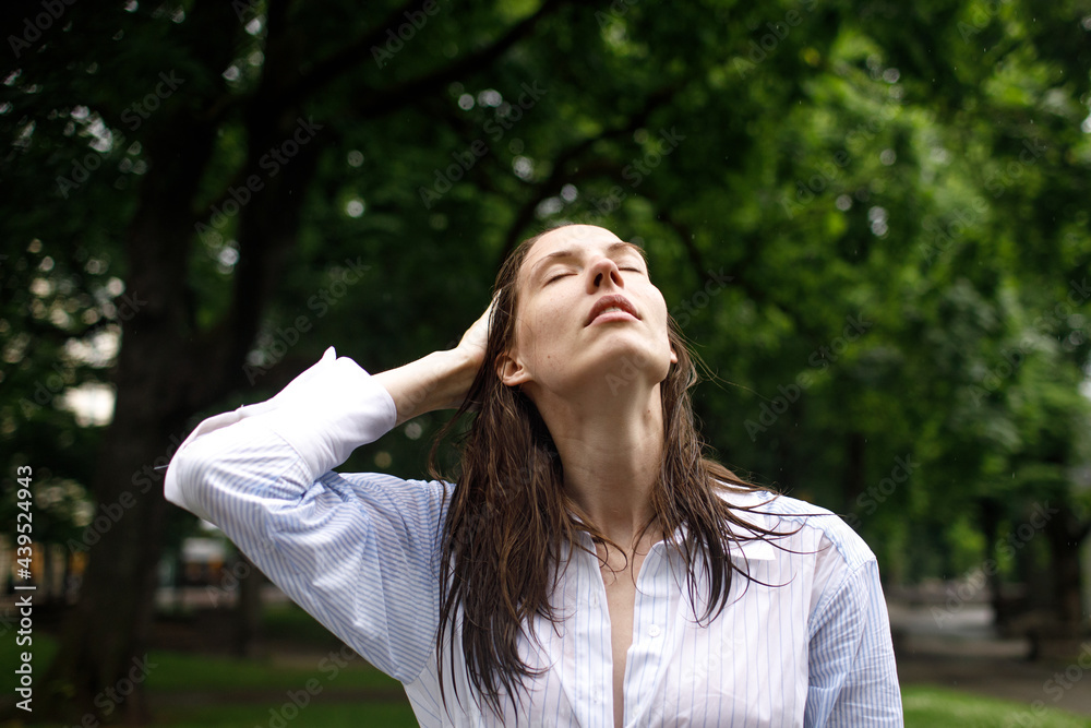 Young woman in nature. People and forest. Healthy life style. Happy walk in park. Outdoor activity casual girl lifestyle. Mind developing and maintaining positive energy. Happily Daily life.