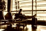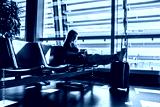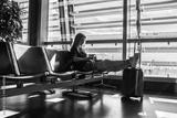 Woman waiting aircraft in airport. Young Female tourist traveling using her smartphone device. Online registration in mobile application.