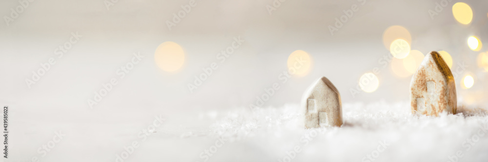 Ceramic figurines of houses in the snow. Christmas decor, winter mood, holiday decoration.