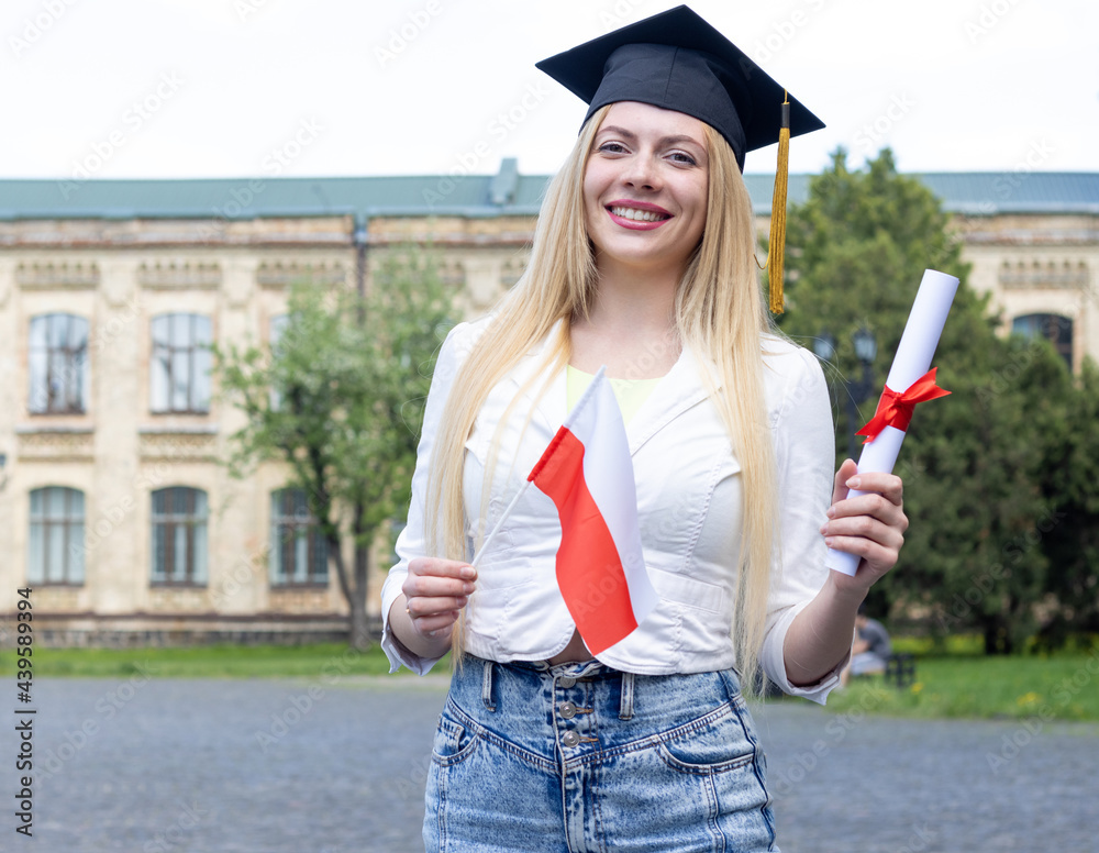 Happy female student graduate with Poland flag and diploma. Graduation day at the university.