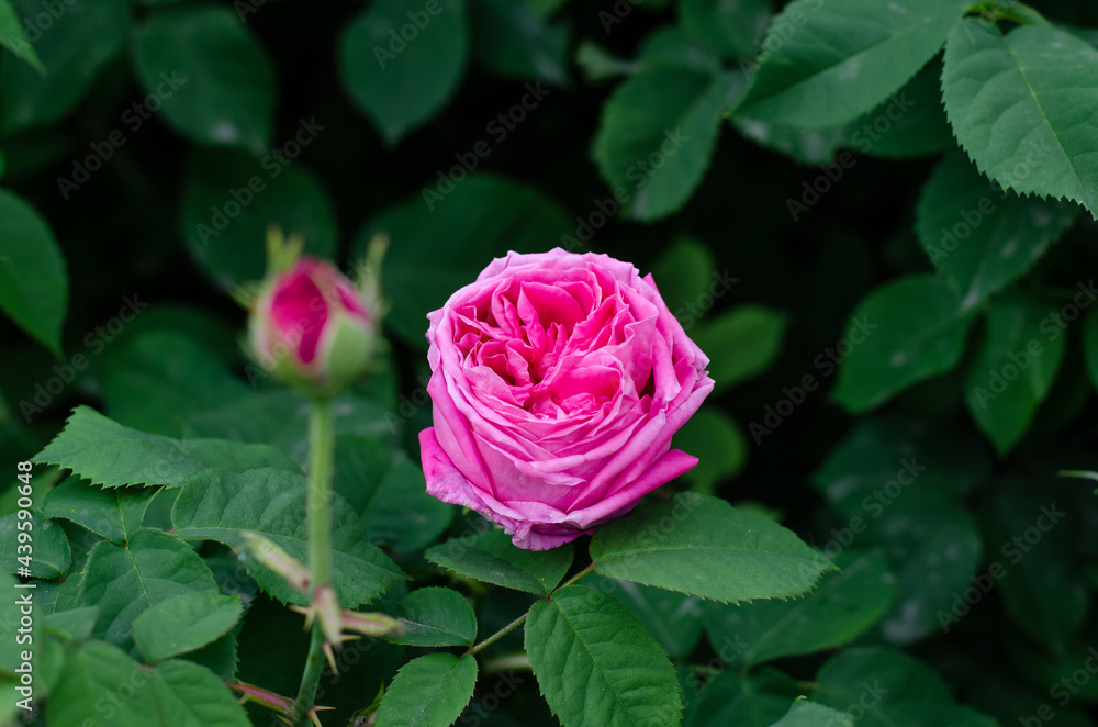 Fresh spring flowers. Flower bed. Pink roses. Raindrops on the leaves. Bouquet of flowers.