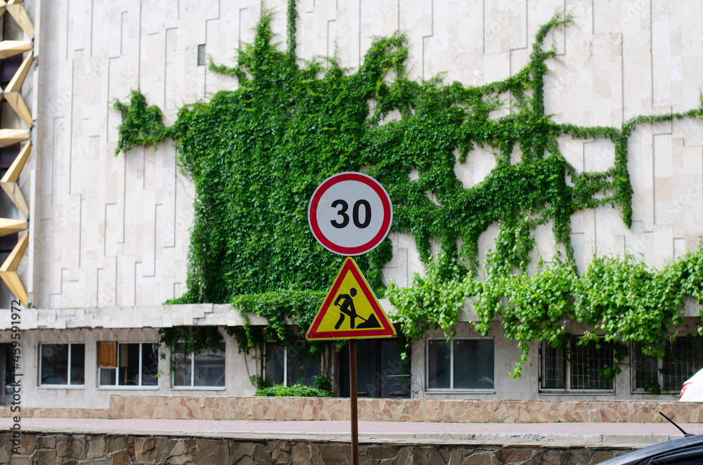 Indicator sign. Road works. Traffic Laws. Car traffic. Pointer.