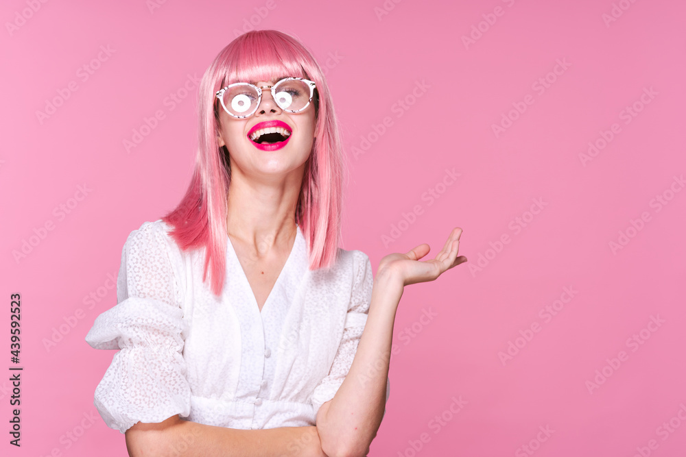 happy woman wearing glasses pink hair gesturing with hands Copy Space