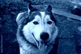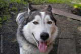 Husky dog smiles, funny happy fluffy dog with his tongue out from the heat looks like a wolf