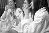 young women in white bathrobe relaxing in spa salon, drinking champagne, celebrating holidays together. beauty, people concept. focus on redhead female taking sip