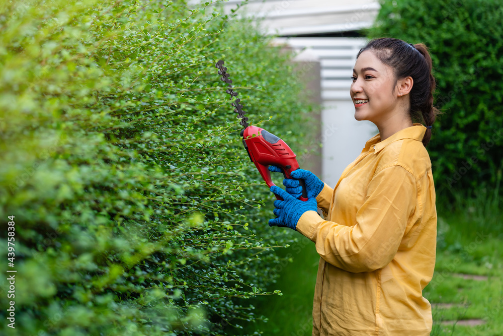 woman using cordless electric hedge cutting and trimming plant in garden at home