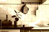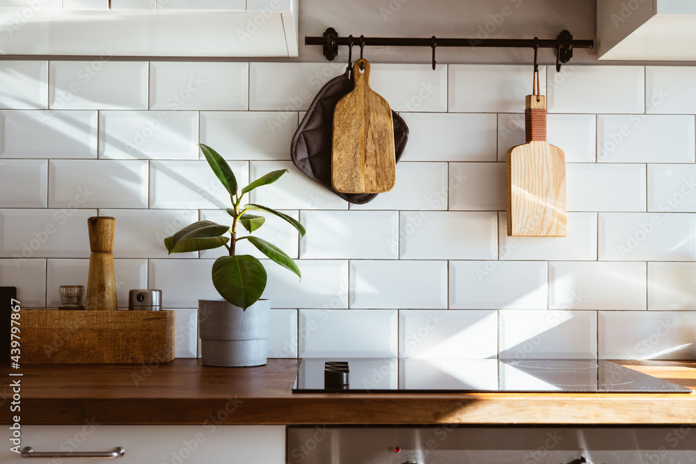 Kitchen brass utensils, chef accessories. Hanging kitchen with white tiles wall and wood tabletop.Green plant on kitchen background early morning light