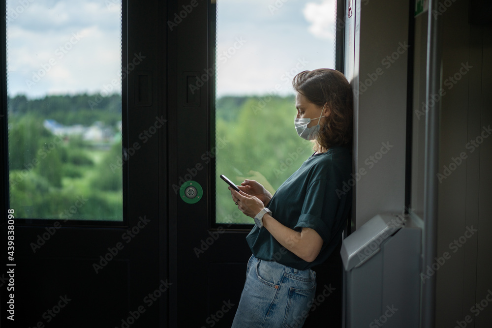 Young beautiful woman in a medical mask in a high-speed train looking at the smartphone screen while traveling while standing at the door