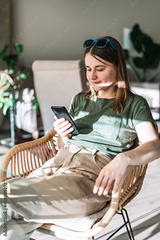 Young pretty woman in green beige clothes sitting in wicker chair and texting in sunlight and shadows, earth colors, using smartphone