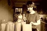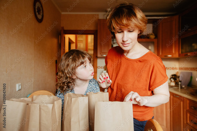 Family sorts out purchases in the kitchen. Mother and daughter tastes products in bags made of craft paper. Food delivery in conditions of quarantine