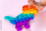 Popit rainbow toy in rainbow colours and dino shape. Trendy bubble pop fidget. Funny anti stress sensory trend. pink background and finger popping the bubbles.