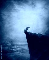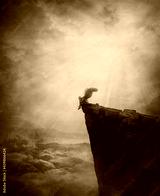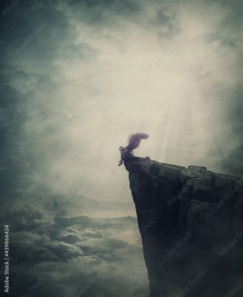 Surreal scene with an angel fallen in limbo, sitting alone on the edge of a cliff between the skies. Magical winged creature expelled from paradise. Metaphorical and conceptual imaginary world view