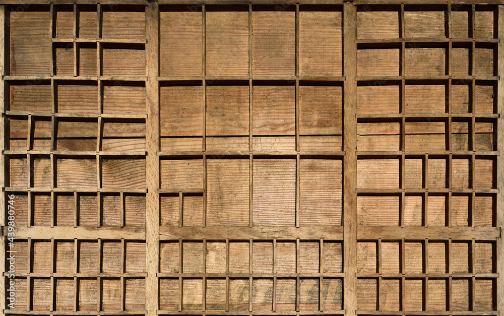 Background from an old wooden type case with many small empty compartments, which is very weathered and shows traces of use
