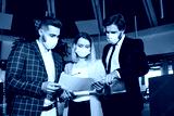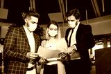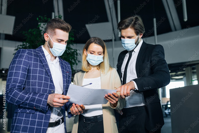 Business people in a face mask with documents in the office corridor. They discuss the new project and follow the rules under the hour of the pandemic. New working life.
