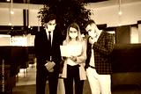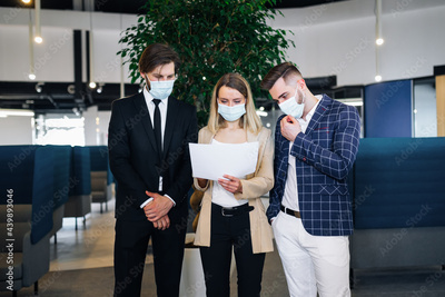 A female colleague and two masked men are talking in the office. discussion colleagues look at documents. Hygiene in offices during the covid 19 coronavirus pandemic.