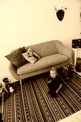 Cool trendy hipster boy 2 years old wears black posing at the decorated photozone of autumn decor with beautiful bright autumn leaves, pumpkin, apples.