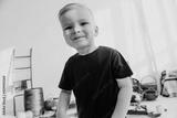 Cool trendy hipster boy 2 years old wears black posing at the decorated photozone of autumn decor with beautiful bright autumn leaves, pumpkin, apples.