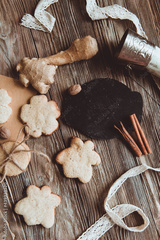 Close up of homemade ginger cookies, cinnamon, ginger on a wooden table. Copy space. Retro toned image, flat lay