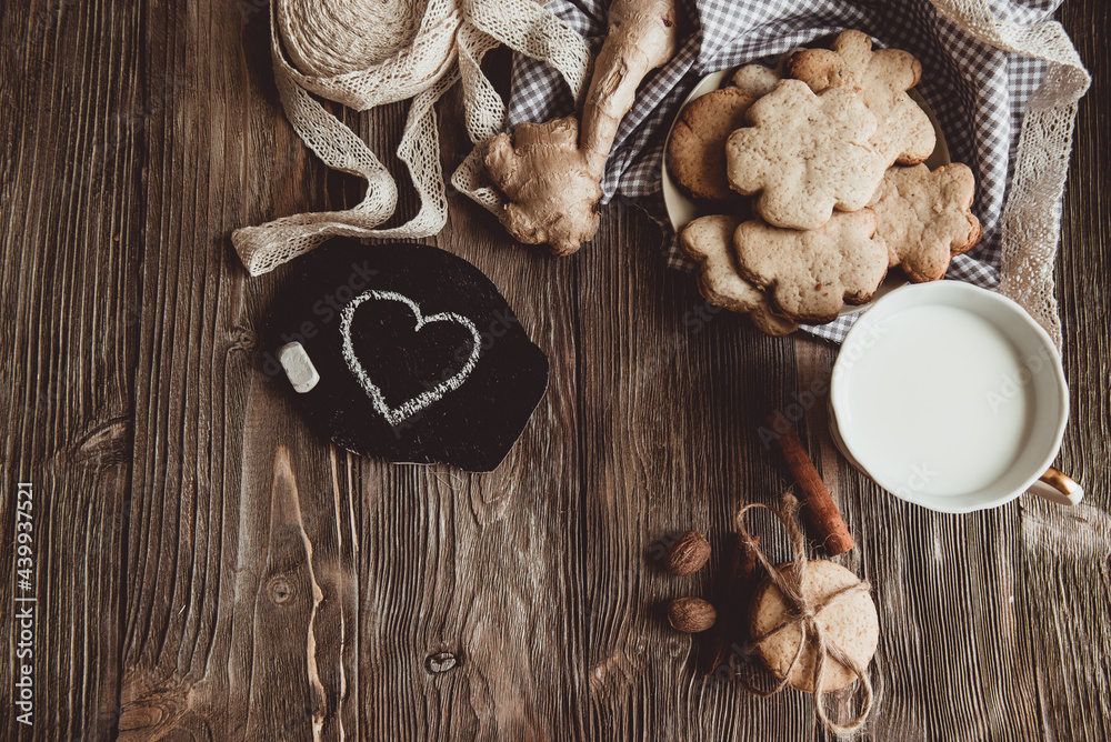 Close up of homemade ginger cookies, cinnamon, ginger with cup of milk on a towel wooden table. Copy space. Retro toned image, flat lay