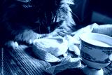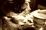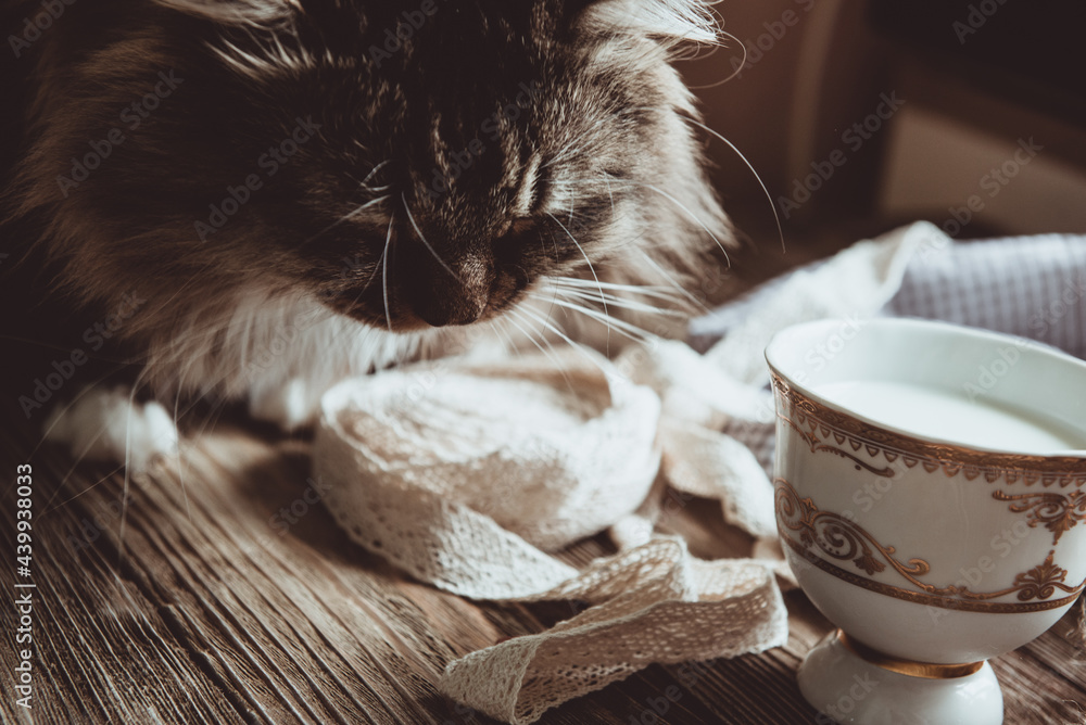 Cat drinking milk. Close up of homemade ginger cookies, cinnamon, ginger with cup of milk on a towel wooden table. Copy space. Retro toned image, flat lay