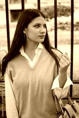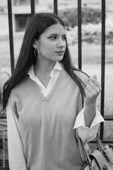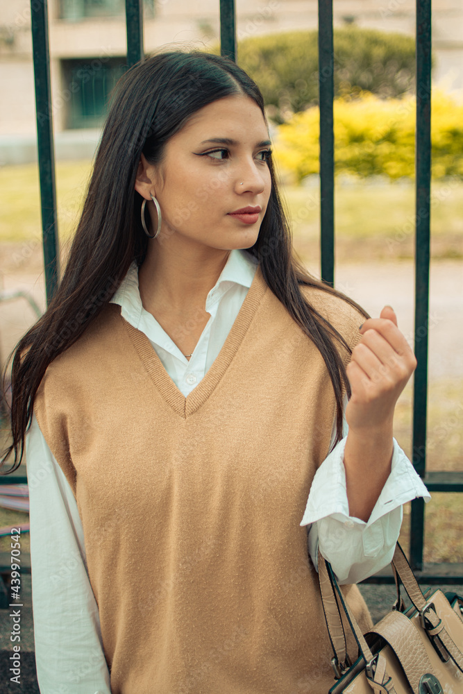 Beautiful Caucasian woman from her side profile wearing a white shirt and a beige vest