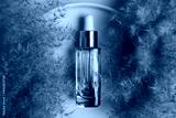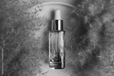 An amber bottle for essential oils and cosmetics stands on pink plate with reeds. Glass bottle. Dropper, spray bottle. Natural cosmetics concept.