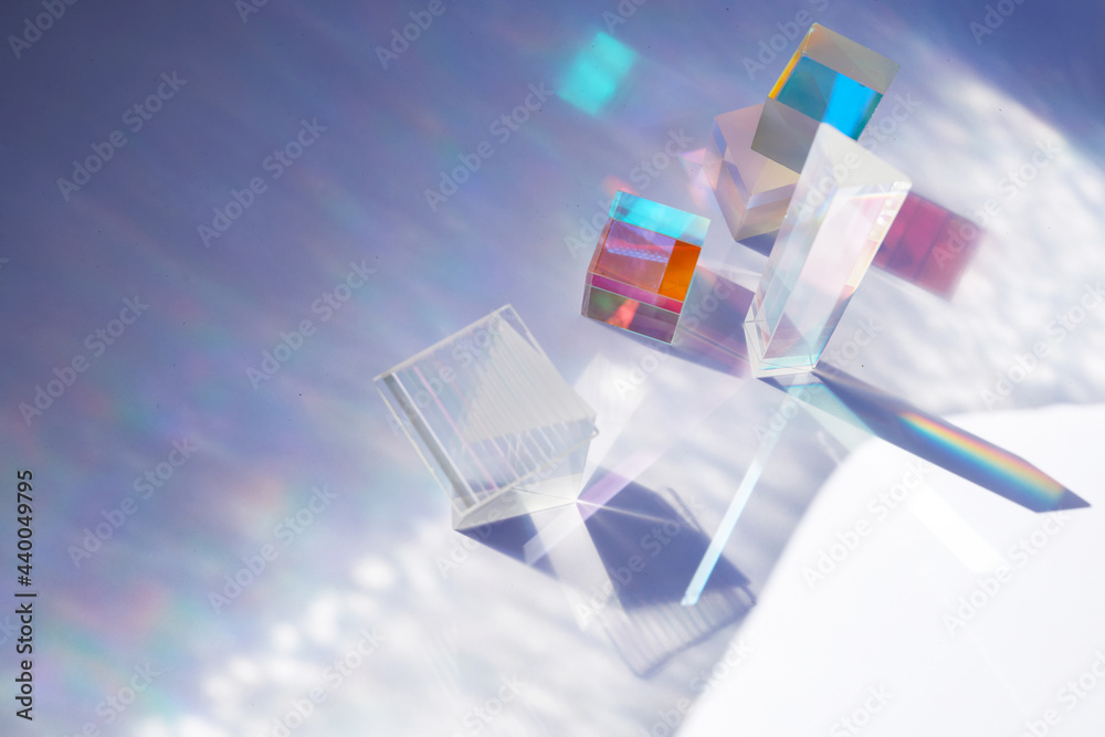 Abstract background with glass geometric figures prisms with light diffraction of spectrum colors and complex reflection.