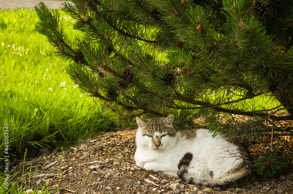 Cat sleeping under a pine tree in Priekule, Latvia.