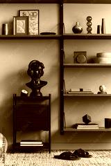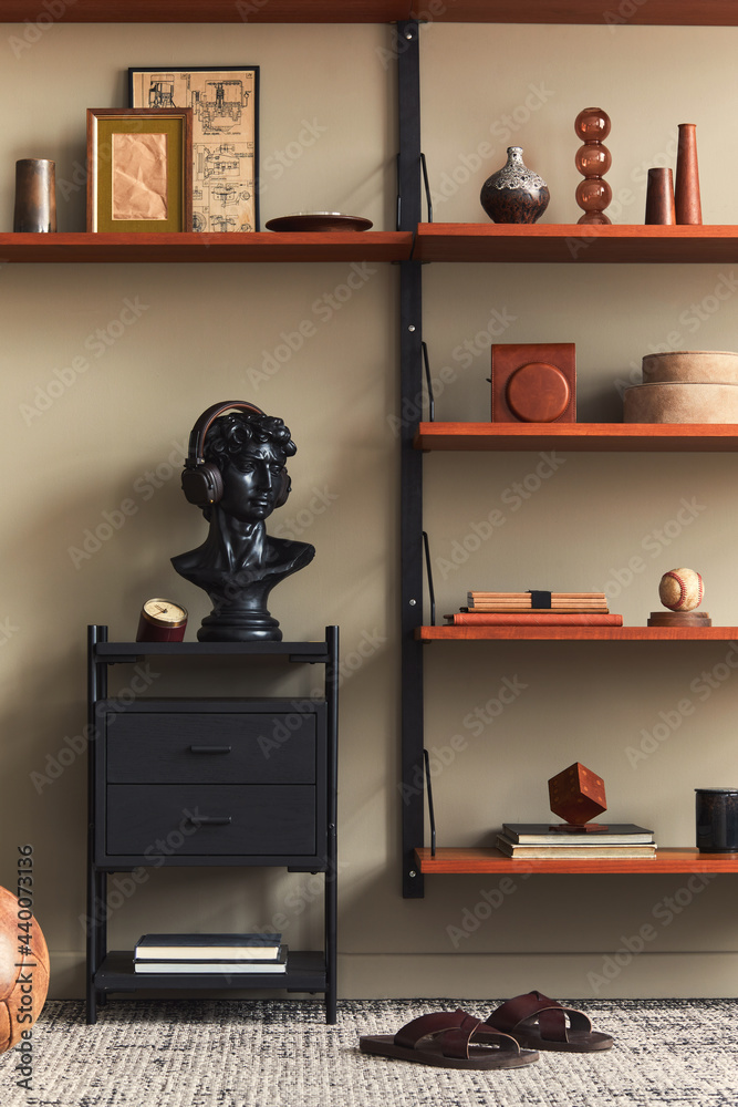 Stylish interior of living room with design black statue, wooden bookcase, pendant lamp, carpet decor, picture frames and elegant personal accessories in modern retro home decor. Template.