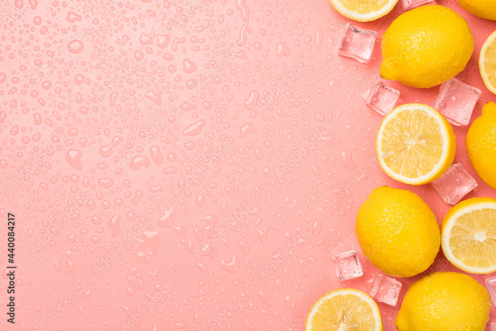 Top view photo of cut and whole yellow lemons ice cubes water drops on isolated pastel pink background with blank space on the left