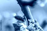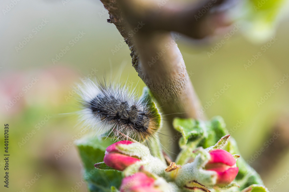 Close up macro view of caterpillar on branch of blossoming apple tree.
