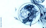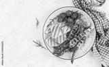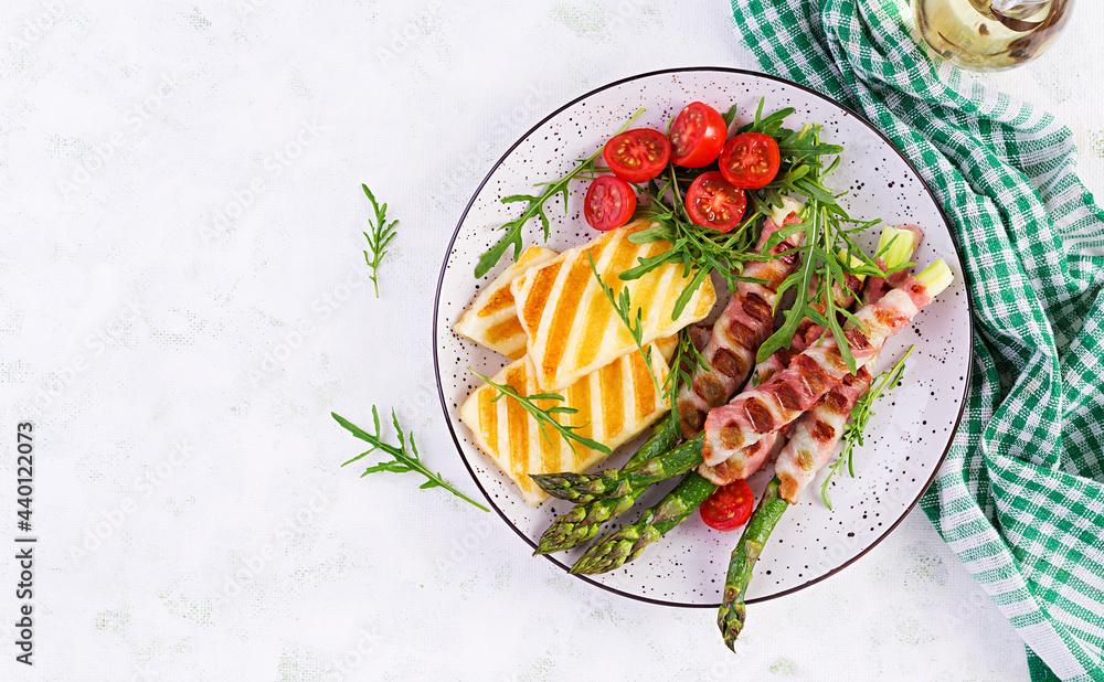 Grilled halloumi cheese salad with tomatoes and asparagus in strips of bacon on plate on light background. Healthy food. Top view, flat lay