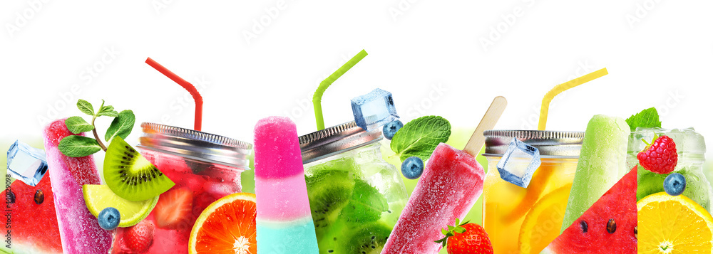 Bright Summer cocktail drinks, popsicles and fruits on a white background.