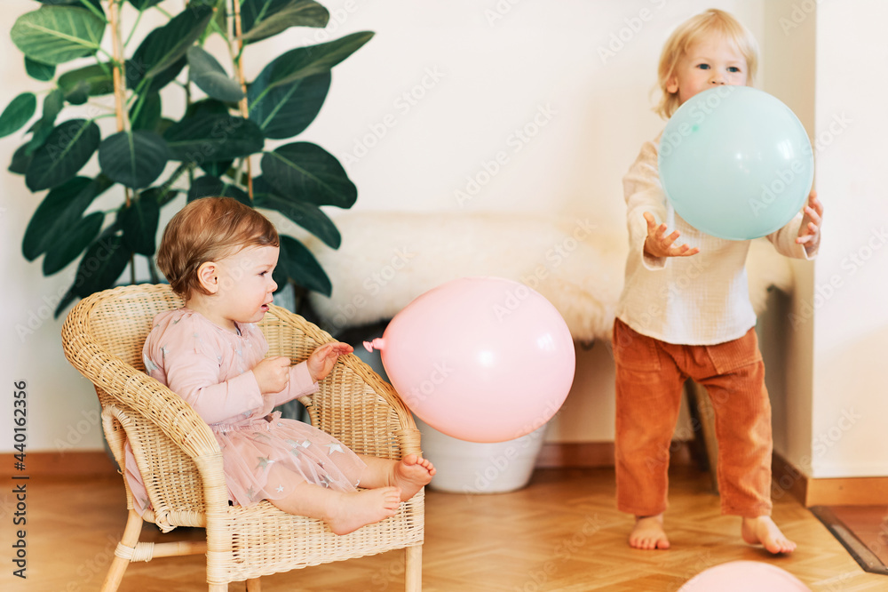 Adorable toddler girl and preschooler boy playing together with colorful balloons at home, siblings having fun