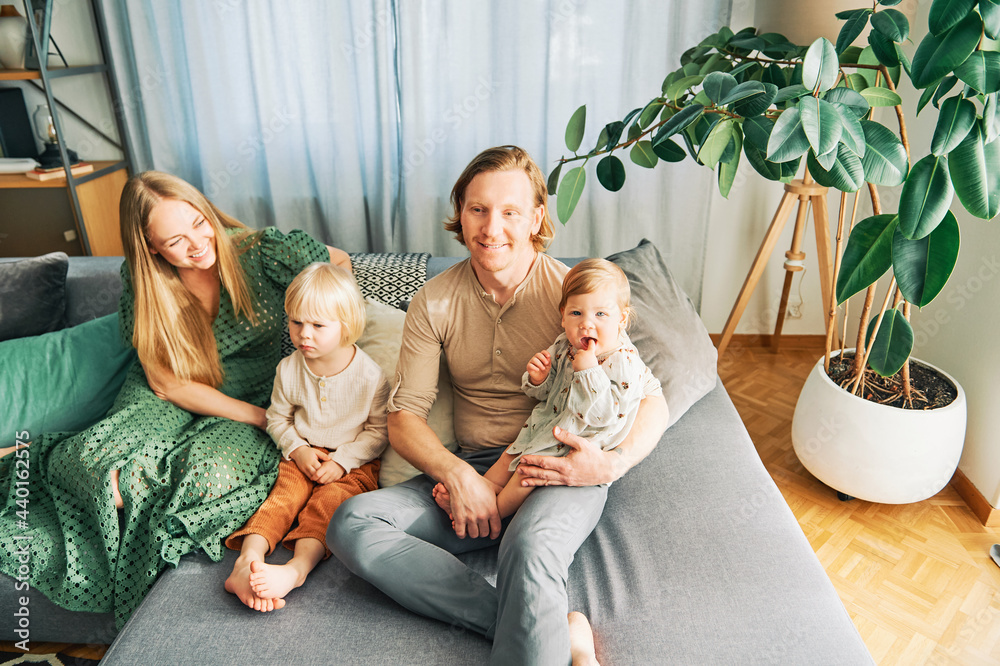 Happy young family of four relaxing on a couch, couple playing with baby girl and toddler boy
