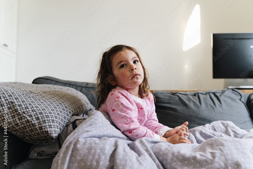 Toddler girl with chickenpox measles on the body. Varicella virus childhood contagious disease. Itchy red blisters, fever, pain symptoms.