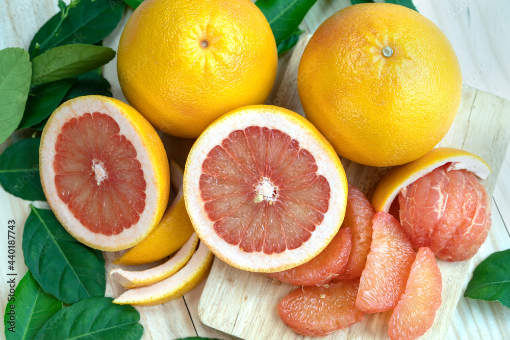 Fresh Grapefruit with leaf on wooden background, Fresh Yellow pomelo with slice on wooden Background.