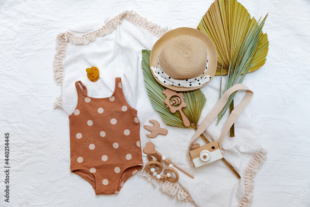 Vintage baby swimsuit on white background. Summer concept for kids, baby beach accessories. Top view, flat lay, copy space