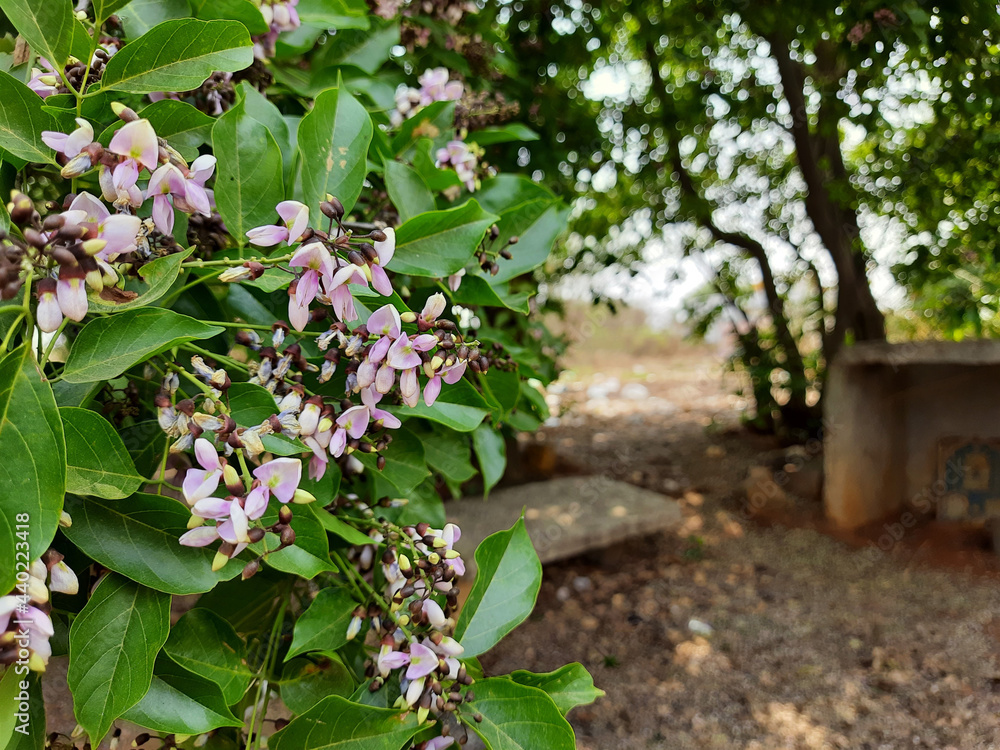 Indian Beech flowers with bright green leaves on tree branches against a blurred background