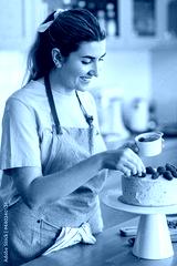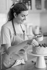 culinary, baking and cooking food concept - happy smiling young woman decorating cake with raspberries on kitchen at home