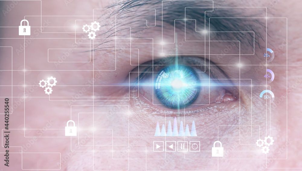 Eye scan interface, Human eye recognition face ID scanning process and high-tech concept, screening big data and digital transformation technology strategy