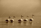 Wild african birds. Group birds of white african flamingos walking around the blue lagoon on a sunny day