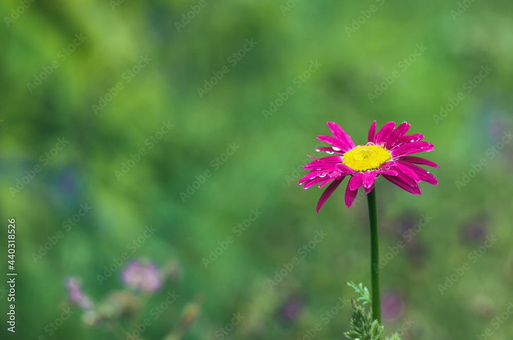 Pink garden chamomile with raindrops on its petals. Copy space.